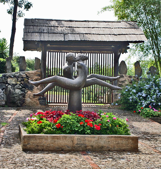 The entrance to Torres' home, with its central bronze sculpture by the artist.