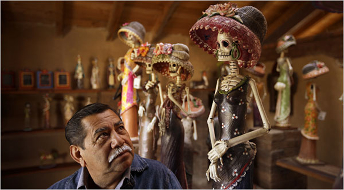 Maestro Juan Torres regards one of the catrinas de barro (clay skeleton figures) that he designed more than 35 years ago. Torres' designs for these figures are based on the late-19th Century drawings of José Guadalupe Posadas, a Mexican political cartoonist of the manners and mores of the Porfiriato (presidency of Porfirio Díaz, 1876-1911). Maestro Torres was the first artist to take Posadas's catrinas from pen-and-ink drawings to three dimensional work in clay.