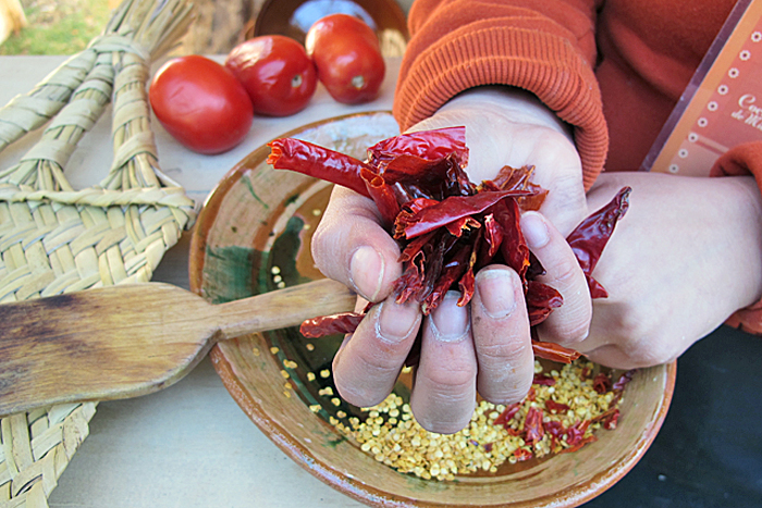 Maestra Benedicta Alejo Vargas grinds cilantro and mint to prepare tzirita, a deliciously spicy botana (appetizer or snack) based on metate-ground chile seeds and various herbs.