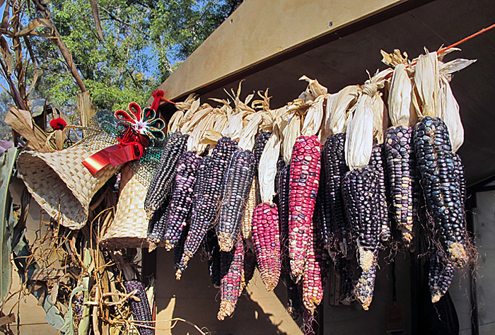 Much of Michoacán's regional cuisine is based on Mexico's native corn.  These dried ears, hung up to decorate a festive food stand at the 2010 Encuentro, show just a few of the several colors of corn native to this area.  The preservation of native corn varieties is crucial to the continuity of the Michoacán paradigm.