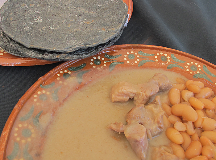 Young cook Susana Servín Galván of Zacán entered the food competition with cuchiatápakua en chile verde con frijoles de la olla, a traditional dish from her small town.  The dish consists of pork meat cooked in a thick sauce made of highly spicy chile serrano and served with freshly cooked beans and blue corn tortillas.  This is my jealously guarded plateful; the dish was stunningly delicious and sold out quickly.  I was lucky to taste it.