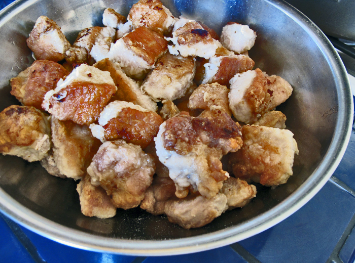 Pat the 2" pork cubes as dry as possible with paper towels.