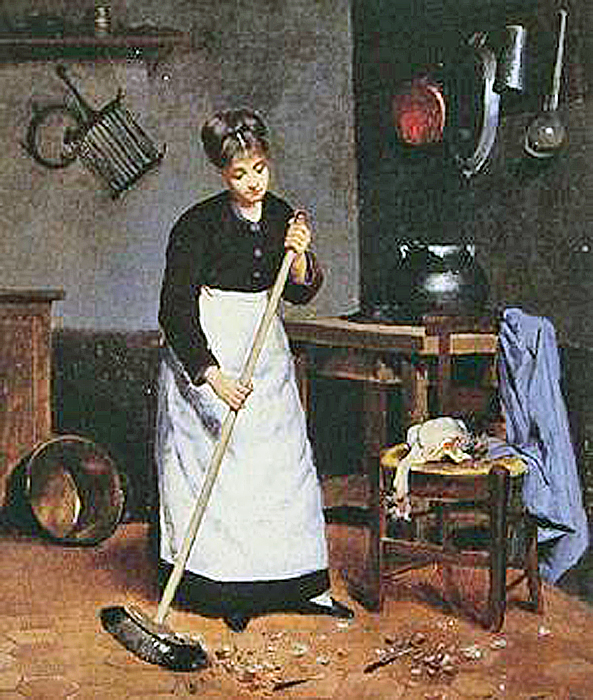 Sweeping the Feathers, by Victor Gabriel Gilbert.  It's the custom in Mexico to thoroughly clean the house prior to the start of the New Year–you don't want to bring any leftover mugre (dirt) into the clean, fresh year.