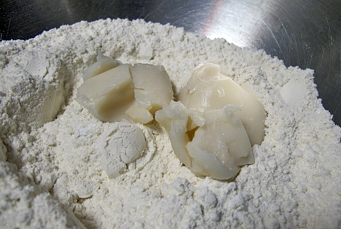The flour mixture that will become the dough for topping the cobbler. You see the lard on top of the flour mixture, ready to be worked into it.