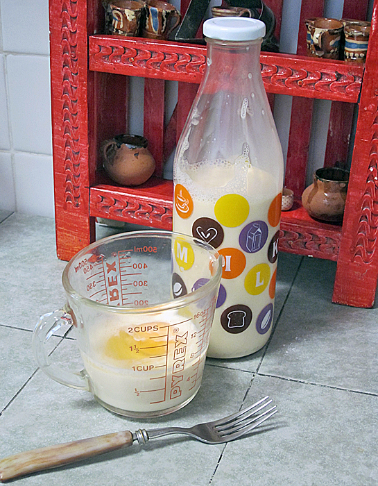 Blackberry cobbler, as you might have guessed, is not in the Mexican food repetoire. However, when all of the ingredients are grown or made in Mexico, maybe it should be. In the photo are salt, baking powder, an egg, two limones, standard-grade sugar, milk, and freshly rendered pork lard. Lard, so shoot me!