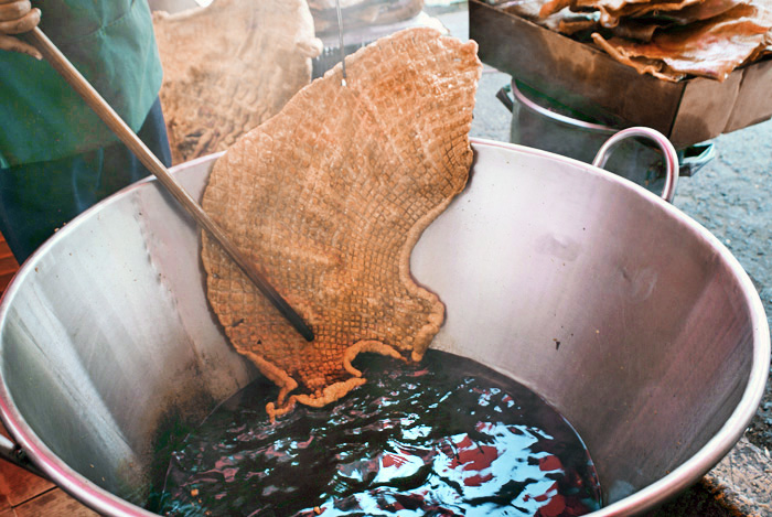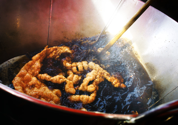 Fresh chicharrón, almost ready to eat, gets a final dowsing with boiling oil.