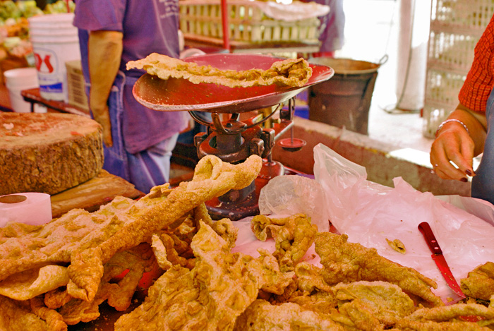 Fresh chicharrón can be delgado (thin, above) or gordito (thick, below). Chicharrón delgado is just the crispy, crunchy fried skin of the pig. Ask the vendor to weigh out as much or as little as you need; in Mexico, chicharrón is sold by the kilo. You can see the old-fashioned scale that my vendor uses in the photo above. Other vendors at the tianguis use digital electronic scales.