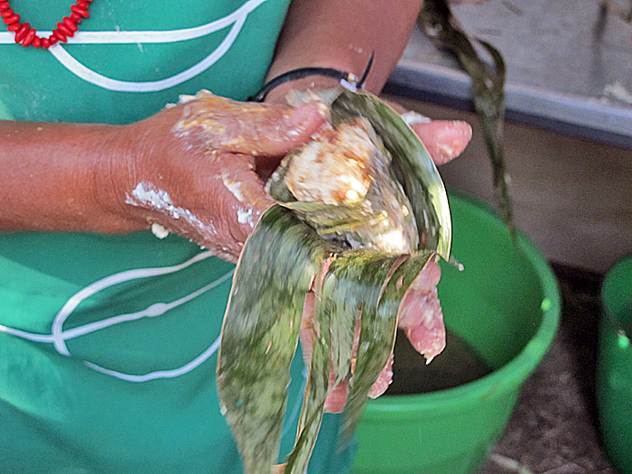 Sra. Cayetana Nambo Rangel of Erongarícuaro prepared choricorundas, a type of pyramid-shaped corn tamal filled with cooked chorizo, a spicy pork sausage.  The corunda is wrapped in a long green corn leaf (not a corn husk) and then steamed.  Traditionally, corundas can be either blind (made without a filling) or filled.