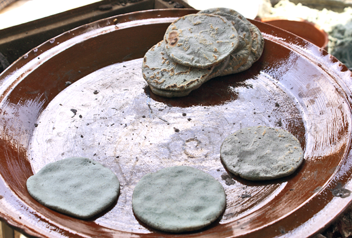 Blue corn gorditas (thick tortillas) toasting over wood fire on a clay comal. These gorditas are also hand-patted, but are left relatively thick so that after toasting, they can be split and stuffed with your choice of delicious fillings and salsas.