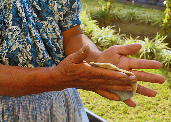 For milennia, corn tortillas have traditionally been made by hand. Small balls of corn masa (dough) are rhythmically patted into near-perfect rounds, then toasted on a comal (griddle) over wood fire. The technique is passed from mother to daughter and mother to daughter in families everywhere in Mexico; girls start pat-pat-patting masa into tortillas almost from the time they start to walk.