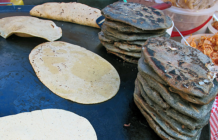 The blue-gray oval antojitos are tlacoyos, a Mexico City specialty. They are ordinarly stuffed with either frijolitos refritos or requesón (a cheese similar to ricotta), toasted on a comal (griddle), and topped with red or green salsa, lettuce, cheese, and crema (Mexican table cream). The beige ovals to the left on the comal are for making quesadillas.