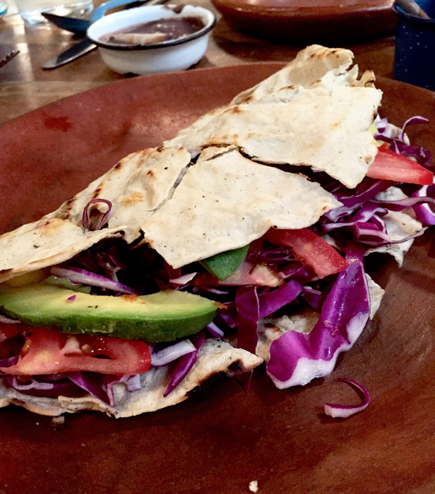 My choice for comida was mole negro con guajolote (black mole with turkey). I loved the vegetable garnish: tender flor de calabaza (squash flowers) and still-crunchy baby calabacitas (similar to zucchini). The turkey was tender, but once again, the sauce was seriously over-salted.