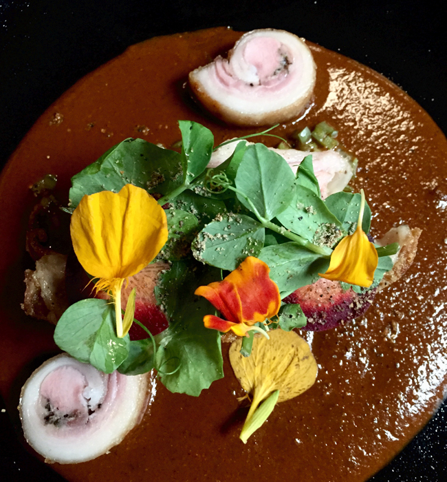 Two of the four of us ordered this cooked-over-low-temperature lechón en pipián de pepita (suckling pig in pumpkin seed sauce) with nopales (diced cactus paddles), pea shoots and nasturtium flowers. Although the flavors were exquisite, the meat was extremely fatty and the sauce quite over-salted. With just a bit more attention to the details, this dish will have the potential for greatness.