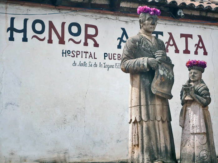 Don Vasco de Quiroga and a Purépecha woman, carved in cantera (a volcanic stone) and crowned with flowers. Outside the huatápera in Santa Fe de la Laguna, where Tata Vasco, as he is lovingly called to this day, founded the first hospital (house for shelter and relief) in Michoacán.