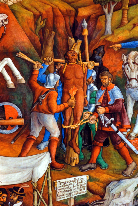 Torture and death of the last Purépecha king. Detail of mural titled "La Historia de Michoacán", painted in 1941-42 by Juan O'Gorman on the back wall of the Biblioteca Gertrudis Bocanegra, Pátzcuaro, Michoacán.
