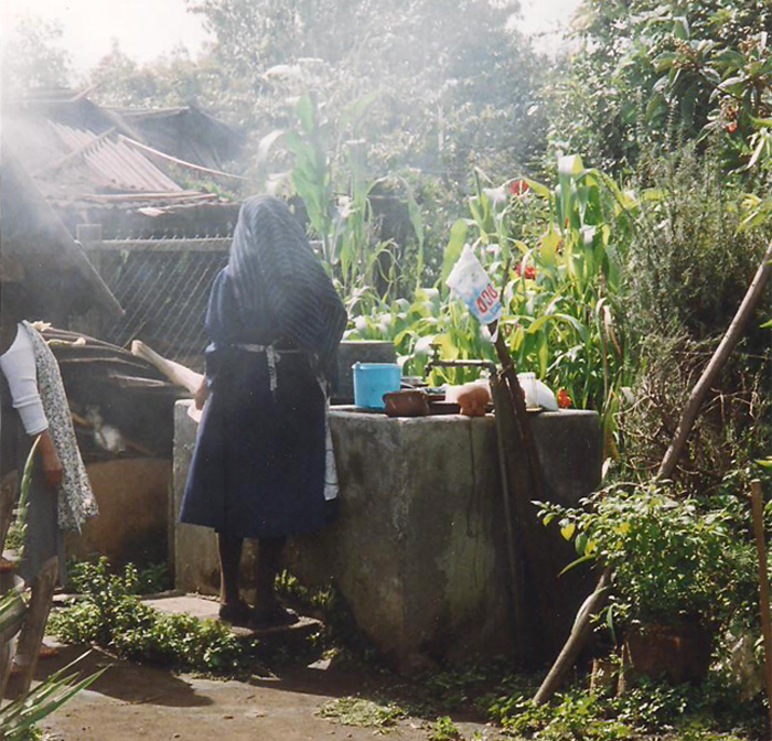 A close Purépecha friend, Débora Cortés, who has passed away since I took this photo, washed dishes in an outdoor pila (combination water storage basin, sink, and scrub board). The pila is the only source of running water for the household. Her bathroom was an outdoor toilet.  She warmed water for bathing in buckets placed in the afternoon sun.  My friend was fortunate to have a township water source rather than face the daily necessity of hauling water from a well.  Note the roof of the troje at the upper left of the photo and the stalks of corn at right center.  The greenery closest to the foreground is a coffee tree.  Débora usually kept a pig in the garden, to raise for market and for meat. Mexico Cooks! photo, 2002.