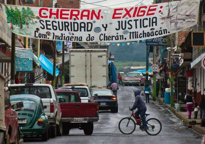 Cherán, an indigenous Purépecha community in the west-central part of Michoacán, is well known for its high level of political awareness and activity. The banner in the photo reads, "CHERÁN DEMANDS SECURITY AND JUSTICE" and is signed, "The indigenous community of Cherán".