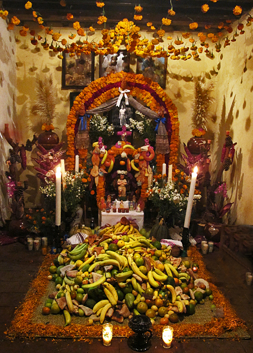 Night of the Dead altar dedicated to a deceased relative, private home, Santa Fe de la Laguna, November 2013. The Purépecha tradition of spiritual and religious practices combines ancient rituals and customs with Roman Catholic beliefs.  The amalgam sustains and nourishes a community which is itself a combination of the ancient and the modern.