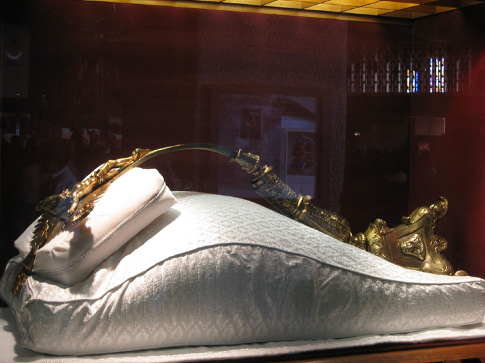 We walked to the back of the Basílica to look at a large, heavy bronze crucifix exhibited in a glass case. The crucifix, approximately 3 feet high, is bent backward in a deep arch and lies across a large cushion. According to the placard and the photos from the era, in 1921 a bouquet of flowers was placed directly on the altar of the Old Basílica beneath the framed tilma. It was later discovered that the floral arrangement was left at the altar by an anarchist who had placed a powerful dynamite bomb among the flowers. When the bomb detonated, the altar crucifix was bent over backward and large portions of the marble altar were destroyed. Nevertheless, no harm came to the tilma and legend has it that the crucified Son protected his Mother.