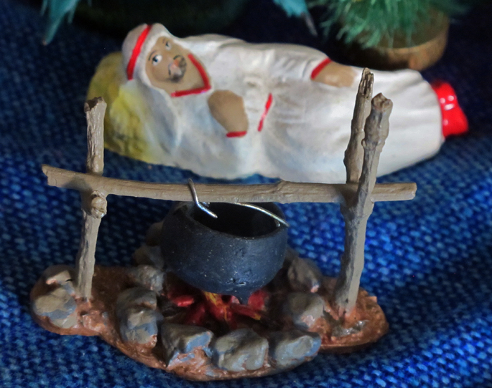 This shepherd keeps watch over his cook-fire in the Mexico Cooks! nacimiento. He's about three inches long from head to toe; the base of the fire is about the same length; the lead props for the pot are about two inches high.