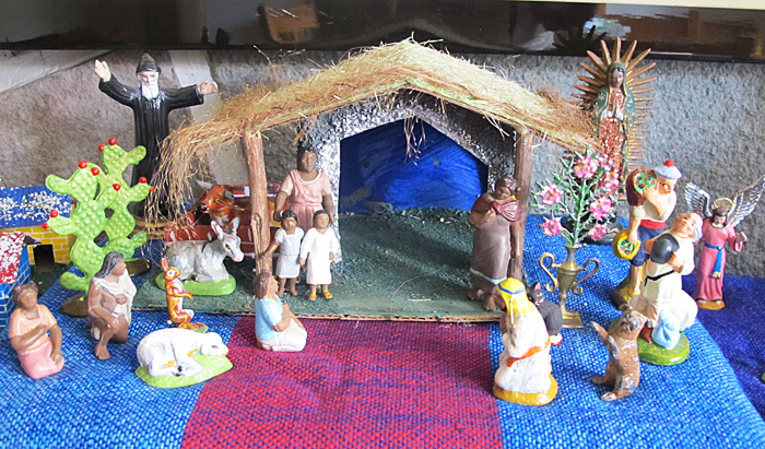 A few weeks before Christmas, our tiny nacimiento de plomo (manger scene with lead figures, none over four inches high) comes out of yearlong storage. The wee village houses are made of cardboard and hand-painted; each has snow on its roof and a little tree in front. You might well ask what the figures in the photo represent: Sr. San José (St. Joseph, who in Mexico always wears green and gold) leads the donkey carrying la Virgen María (the Virgin Mary) on their trek to Belén (Bethlehem). We put these figures out earliest and move them a bit closer to Bethlehem every day. This nacimiento is the one that grows each year; we have added many figures to the original few. This year we expect the total number of figures to rise to well over 200.