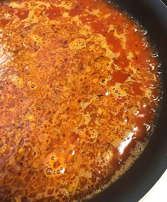 Bring the secret ingredient and the fideos, onions, and chile to a boil in the sauté pan.