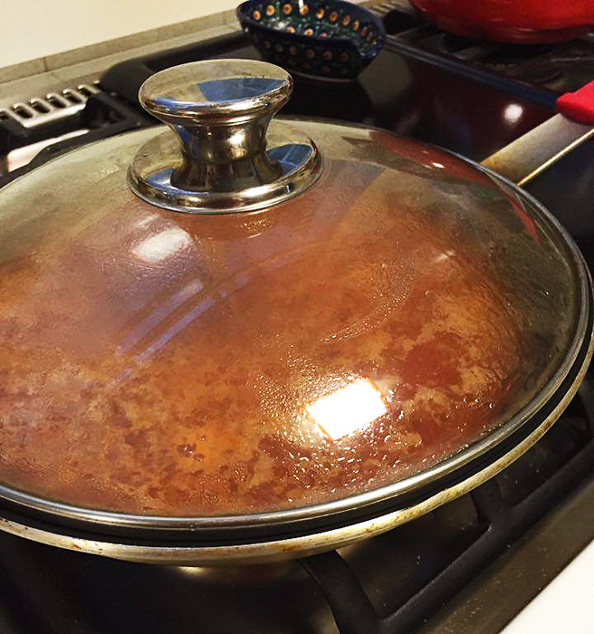 In the sauté pan, melt the lard or heat the oil until either is just shimmering. Add the finely diced onion and the split chile and stir over medium heat until the onion is soft and the chile has begun to blister.
