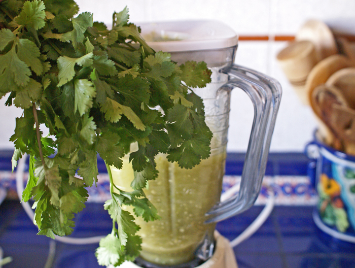 While the blender is running, remove the center of its cap and, little by little, push the cilantro into the whizzing sauce. Blend just until smooth; you should still see big flecks of dark green cilantro in the lighter green sauce. Add sea salt to taste and stir.