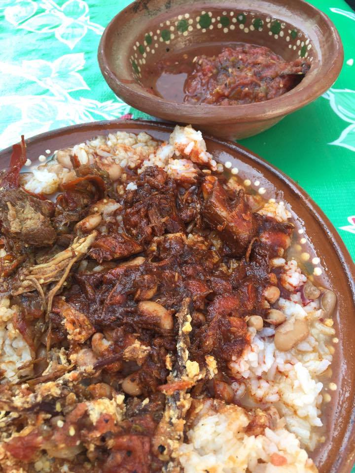 From Restaurante La Tradición in Pátzcuaro, Michoacán–and from the hands and heart of my beloved Victoria González, another of Michoacán's extraordinary cocineras tradicionales–a plate of her fabulous aporreadillo, beans, and rice. Aporreadillo is a specialty of Michoacán's Tierra Caliente; doña Vicky hails from Apatzingán, in the heart of those hot lands, and her preparation of the dish is exquisite. Made of dried beef, scrambled egg, tomatoes, and a delicious broth, I like it best served over rice.