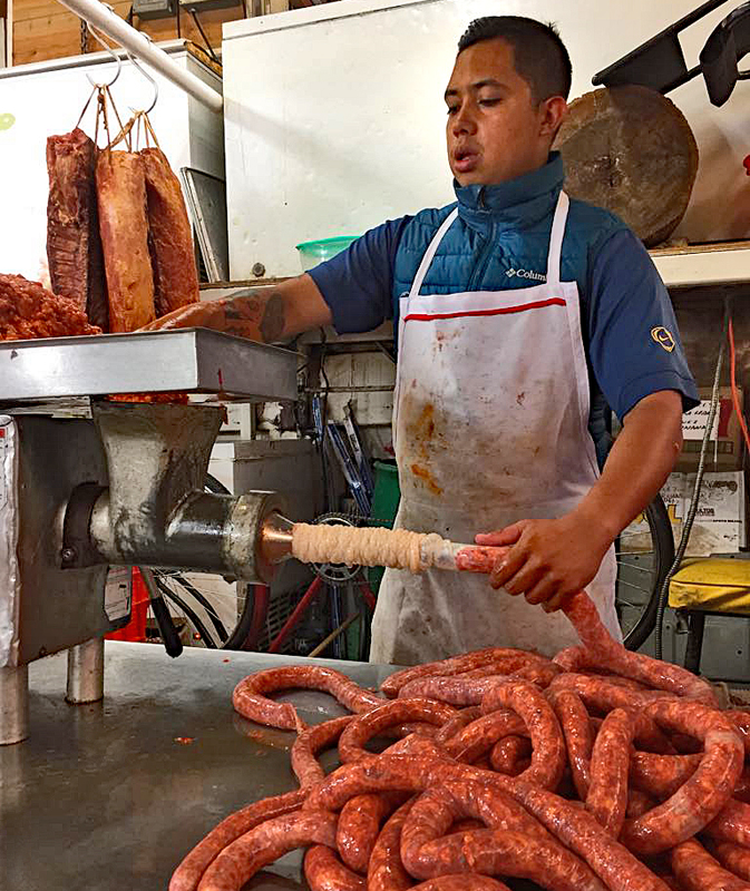 This young butcher at a local market is packing longaniza (a type of spicy Mexican pork sausage) into its casings.