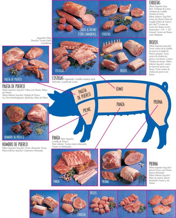Pork cuts chart in Spanish. Even in Spanish, many cuts have different names depending on which country names them. Again, click to enlarge the image for a better view.