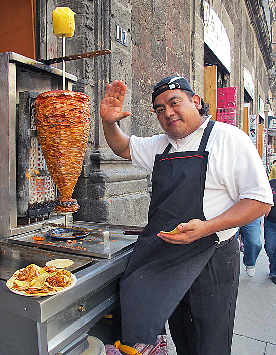 One of the most common and popular (and really delicious) kinds of street tacos is tacos al pastor (shepherd style tacos). This preparation comes from Mexico City. Marinate thinly sliced pork meat in a sauce made of chiles guajillo, vinegar, and tomato. Next, layer the slices on a vertical spit so that they form the shape of a spinning top. At the top of the meat, place a pineapple without skin. Light the fire in the grate behind the spit and allow a portion of the meat to cook until slightly caramelized on the edges and tender within. Slice into very thin pieces, using them to fill a tortilla warmed on the flattop. With your sharp knife, flick a small section of the pineapple into the taco. Add the salsa you prefer, some minced onion and cilantro, and ahhhhh…the taste of Mexico!
