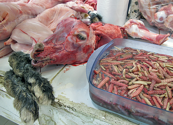 That's a goat head at the left in the photo, at the Mercado de San Juan, Mexico City. To the right is a container of chinicuiles (red maguey worms). The goat head is for preparing birria, the chinicuiles are for roasting and eating as a snack.