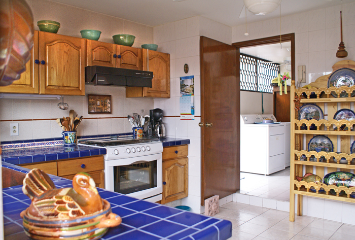 Mexico Cooks!' former home kitchen in Morelia, Michoacán. The pottery, tile countertops and copper sink–and the wooden trastero (dish cupboard)–are traditional styles. The over-and-under-the-counter cupboards and the stove, washer, and dryer are new-fangled modern conveniences.