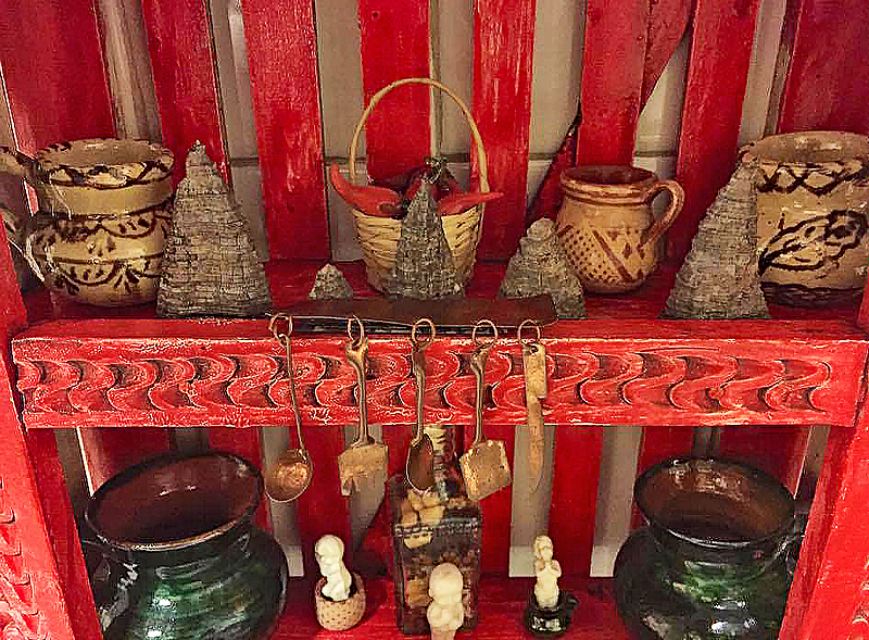 The five pochote spines, with some other tiliches (tchotchkes, little stuff) on the top shelf of a miniature trastero (literally, dish cupboard) in my kitchen. The tallest pochote spine, far left, measures about two inches high.