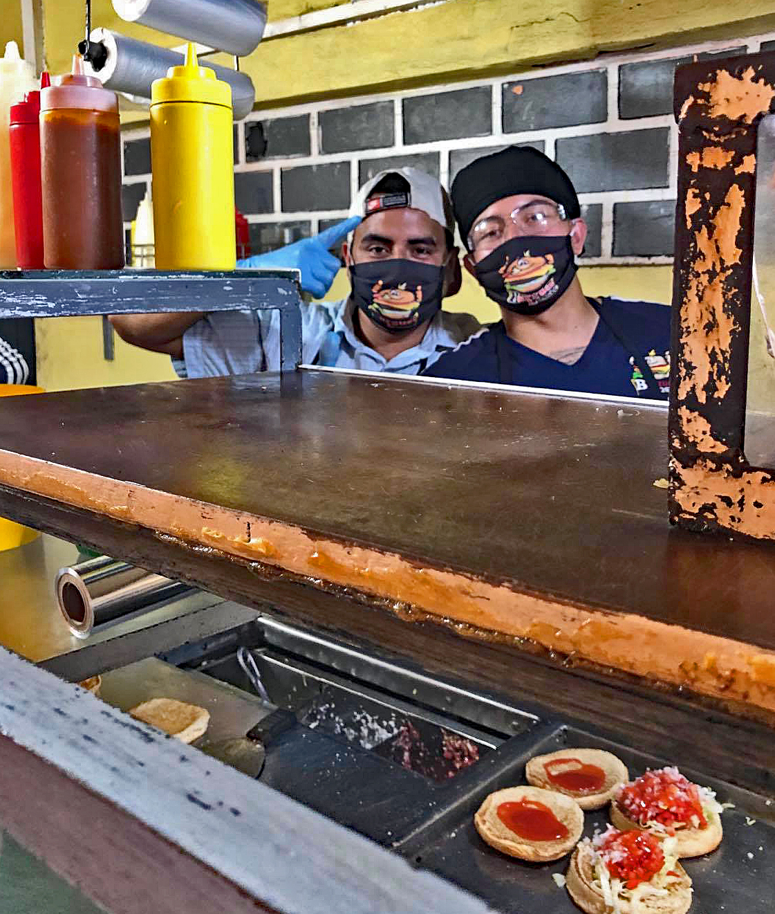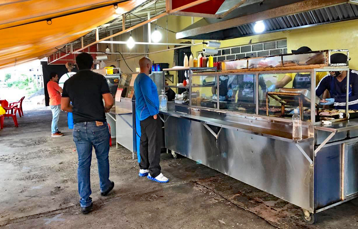 Two long stainless steel grilling areas, where the hamburgers are prepared to order. We were there at about 8:00PM on a Saturday, early for supper in Mexico. Add the general nervousness about going out and you can see that there is almost no one in line. That big empty area where you can see a couple of red chairs is normally filled with tables and chairs–and eaters! Later on the evening we got take-out, even with COVID-19, I suspect there would have been a long line.
