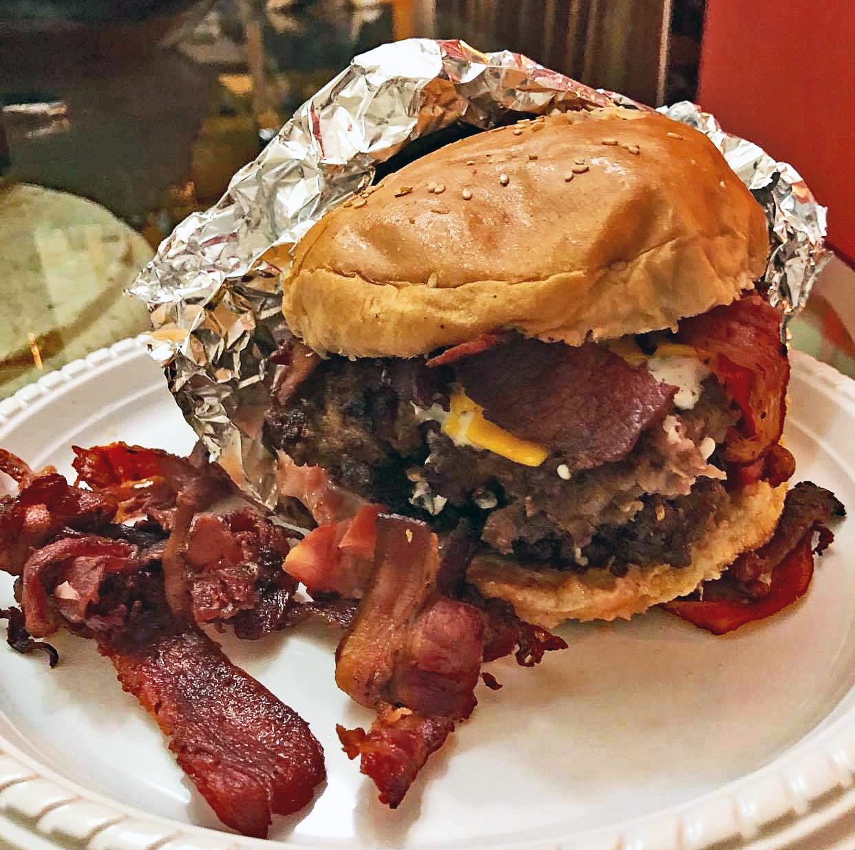 –Single: one big hand-shaped beef patty, one square of yellow cheese and one of white, chopped lettuce and tomato, a really big patty-shaped disk of thick mashed potatoes, and a huge quantity of perfectly fried bacon, all on a gigantic bun.