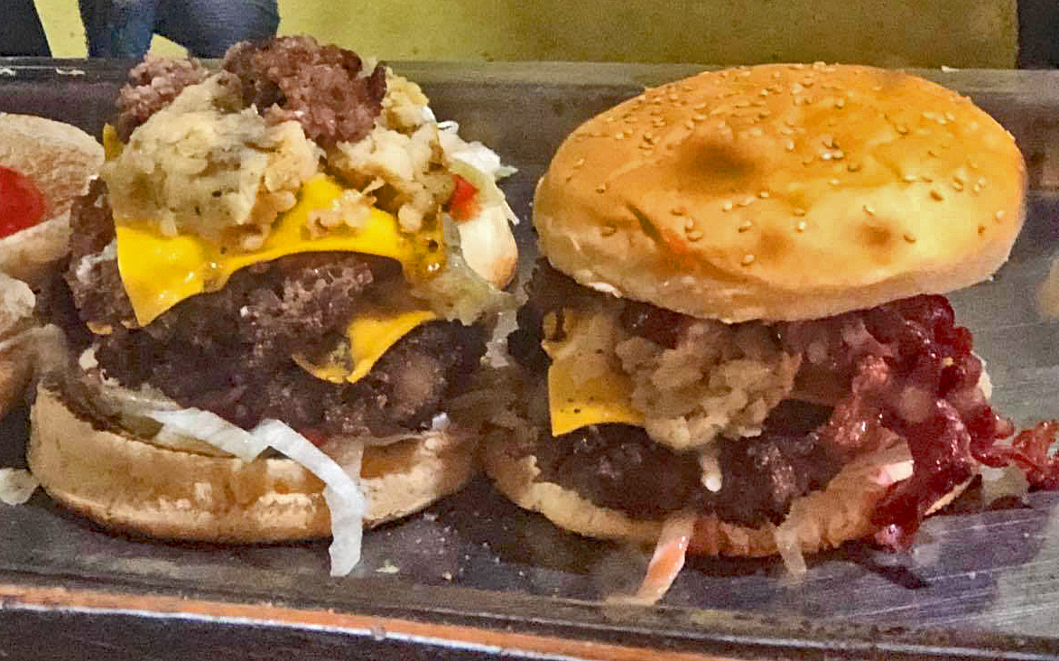 –Double: two big hand-shaped beef patties, two squares of yellow cheese and one of white, and all the rest that the single offers.