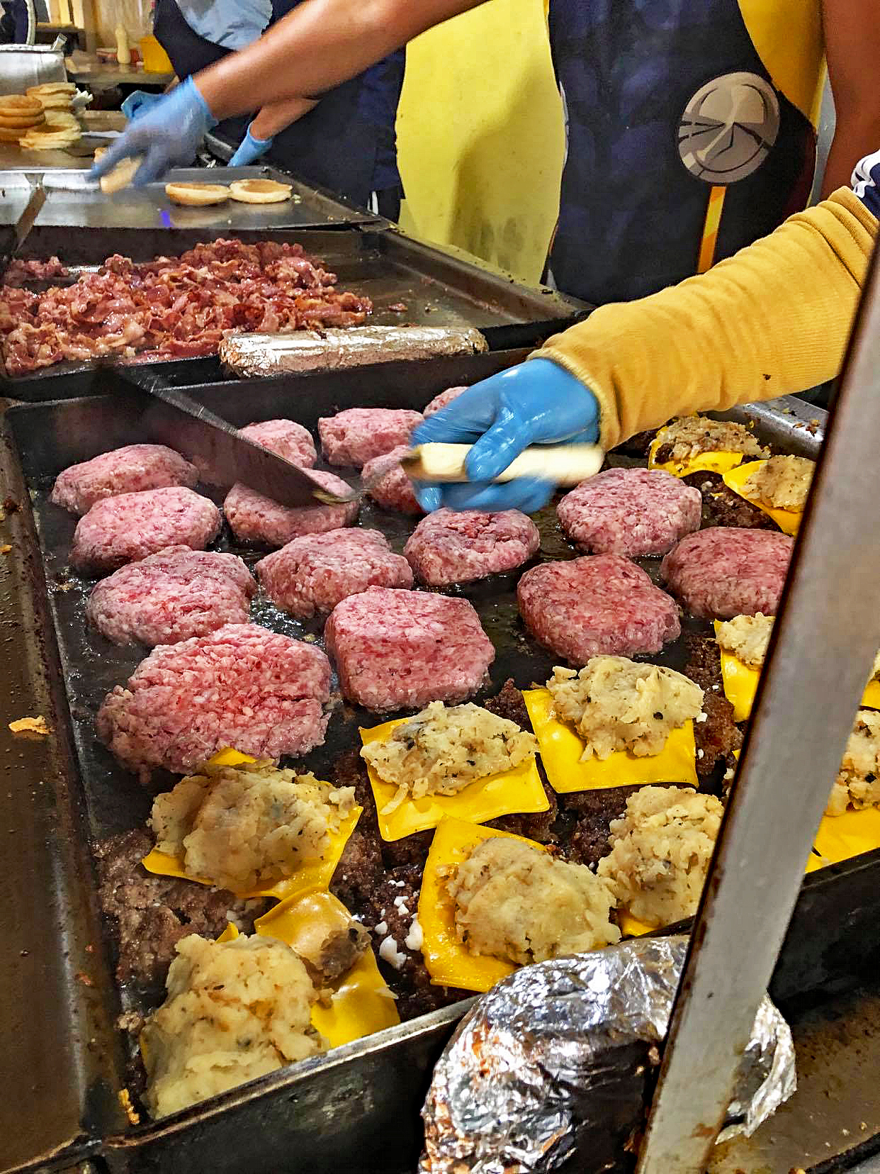 Next flat-top: grilling the enormous hamburgers. Each of those patties is crazy-big. And we ordered a double– did I mention a double each?