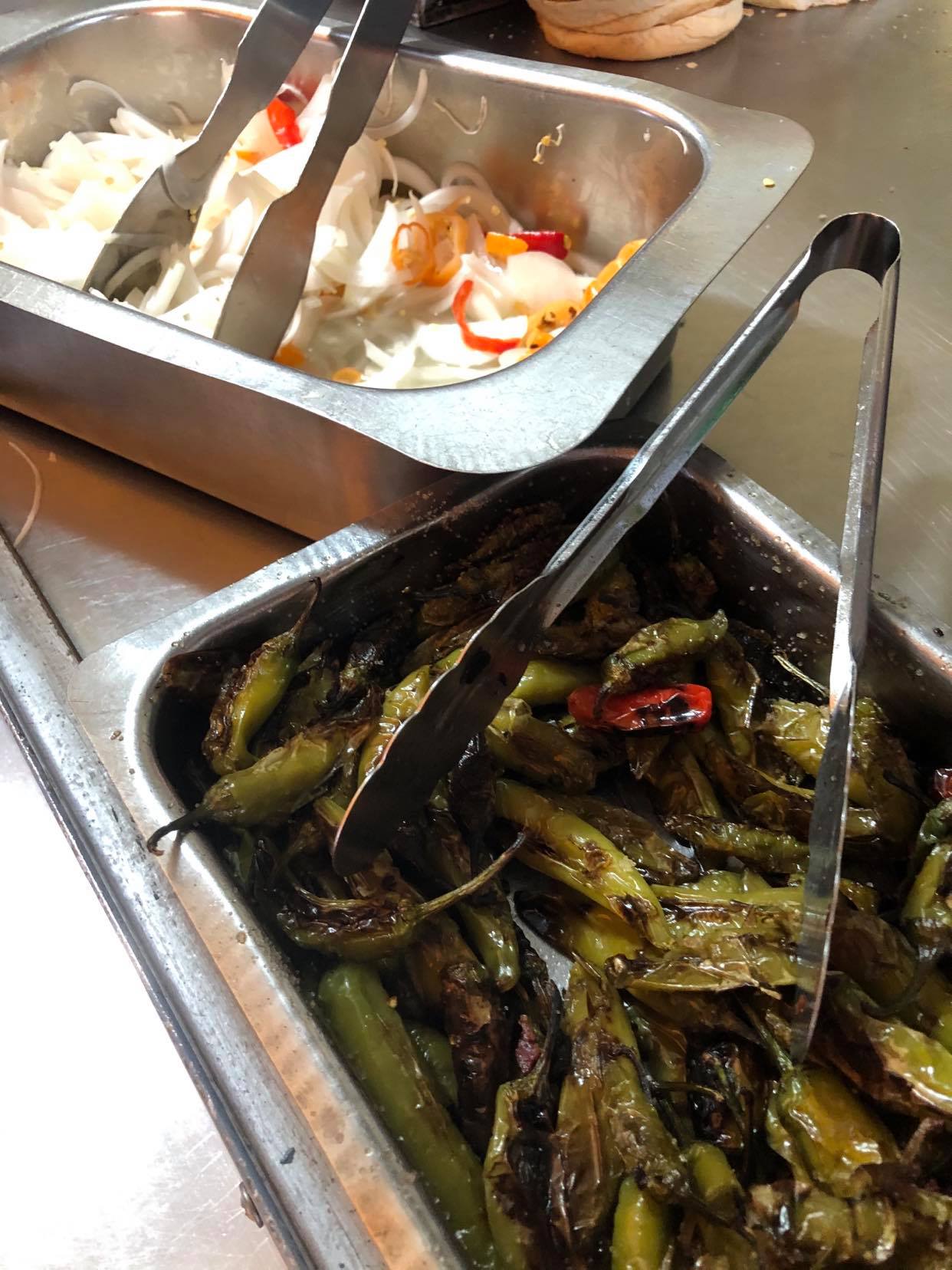Top: an encurtido (cured in vinegar) of raw onions and chiles, for a garnish. Bottom: chiles toreados (grilled with a little oil) to eat as a side.