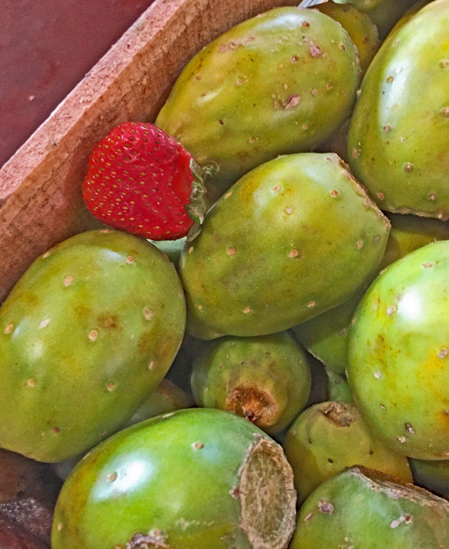 These are the fruit of the nopal cactus, known as tunas. (The red thing to the left is a fresa (strawberry), placed for size comparison.)  Tunas are in season right now; I buy them frequently at this time of year to make agua fresca de tuna ('fresh water' made of tunas).