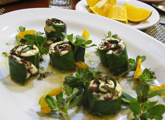 Oaxaca is filled with culinary delicacies not seen elsewhere in Mexico.  Here, a platter of Oaxaca quesillo (think string cheese, but a million times better) stuffed with tiny chapulines (grasshoppers) and rolled jelly-roll fashion in anise-flavored hoja santa (holy leaf).  This is one of the most delicious things Mexico Cooks! has eaten in 2015.  Thank you, Restaurante Las 15 Letras!