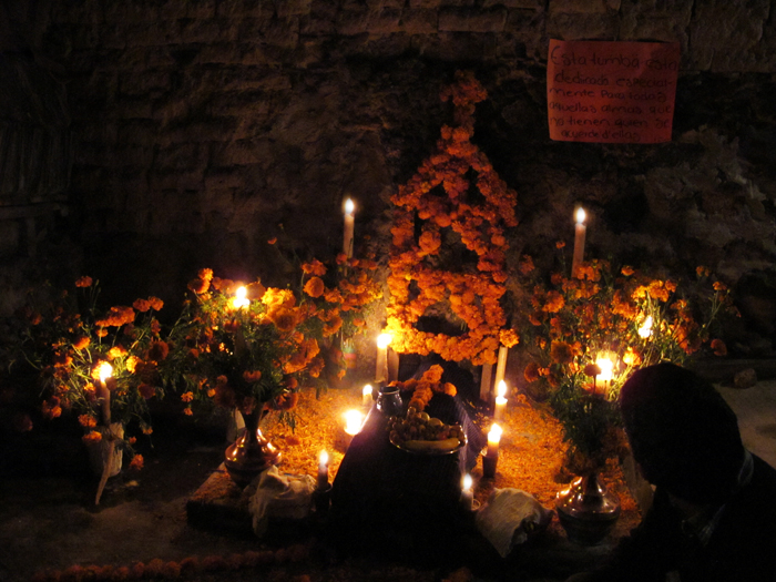 One by one, grave by grave, golden cempazúchiles give shape to rock-bound tombs and long candles give light to what was a dark and lonely place, transforming the cemetery into a glowing garden.  How could a soul resist this setting in its honor?
