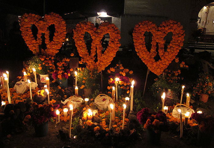 of tall candles lit one by one in the cemeteries.  Tonight is November 1, the night when silent souls wend their way home from Mictlán, the land beyond life.