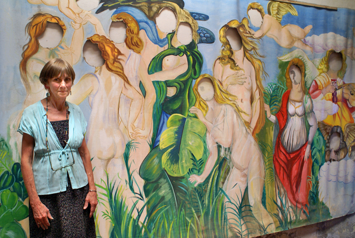 In the Erongarícuaro, Michoacán taller (workshop) of Muebles Finos Artesanales Erongarícuaro–the UNEAMICH wholesale entity branded as mfa/eronga–Marina Rosenthal stands before a custom-painted panorama of canvas nudes. You can put your own face in one of the vacant spots.
