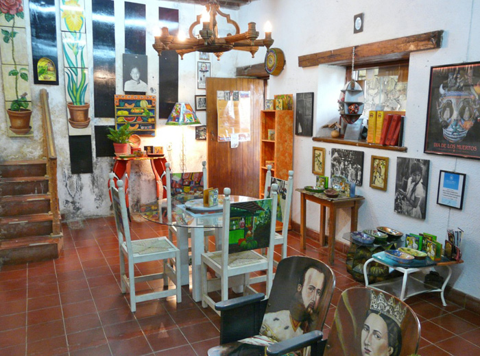 The unprepossessing doorway to UNEAMICH mfa/eronga, the Erongarícuaro, Michoacán artists' cooperative originally founded in 1981 by Steven and Marina Rosenthal. "Go to the corner where the primary school is, turn right, and go halfway down," read Marina's directions. 'Halfway down to what,' wondered Mexico Cooks!, but the building was easy to find. All photos by Mexico Cooks! except as noted.
