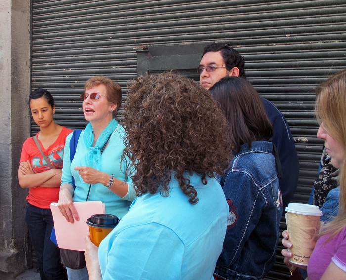 Maestra Sandra Llamas begins the tour of traditional bakeries by offering an overview of prominent Basque bakers in 19th century Mexico City. Approximately 25 people of every young-adult and adult age participated in our three-bakery walking tour.