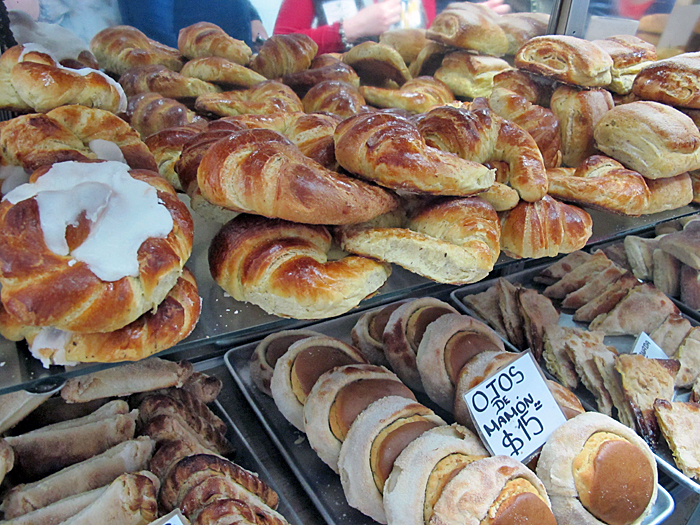 Some things at your bakery are just about the same as they were when the Basques came to Mexico: bread is freshly baked throughout the day and night, it's affordable, and some is still quite delicious. Other things have changed completely: in most commercial bakeries, margarine or vegetable shortenings are used instead of butter, most everything is mechanized, and the lowly, delicious bolillo–Mexico's original white bread–is now more like cotton batting than like honest bread. I have vowed to track down any real bolillo that still exists. It's the best thing since–since before sliced bread! I promise to report back–or if you know where to find it in Mexico City, please let me know!