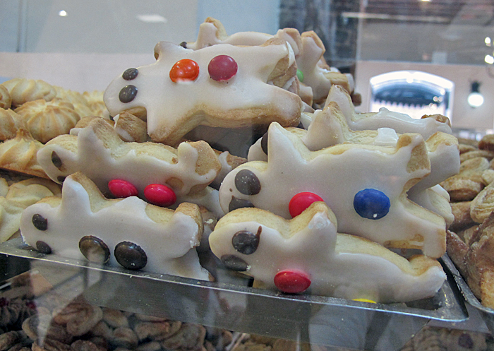 Chocolate cake filled with strawberry marmalade and topped with cream horns, Pastelería La Ideal. In the evening, Mexico City stops back in at La Ideal to buy a little something for cena (light supper): a cake, a gelatin, or some cupcakes or cookies. This cake costs 190 pesos. Click on any photo to enlarge and show details.