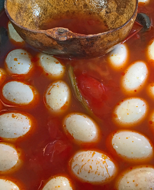 Foods on the altar can include a dish filled with mole poblano or other festive food that the deceased enjoyed in life, a pot of frijoles de la olla (freshly cooked beans), platters of tamales, pan dulce (sweet bread), and piles of newly harvested corn, pears, oranges, limes, and any other bounty from the family's fields or garden. The purpose of the offerings is not to flatter and honor to the dead, but rather to share the joy and power of the year's abundance with him or her.